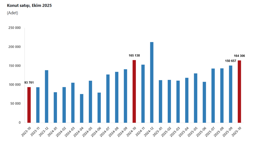 Türkiye genelinde konut satışları Ekim ayında bir önceki yılın aynı ayına göre yüzde 0,5 oranında azalarak 164 bin 306 oldu. Konut satış sayısının en fazla olduğu iller sırasıyla 26 bin 305 ile İstanbul, 14 bin 681 ile Ankara ve 8 bin 678 ile İzmir olurken, en az olduğu iller sırasıyla 86 ile Ardahan, 135 ile Bayburt ve 143 ile Tunceli olarak gerçekleşti.