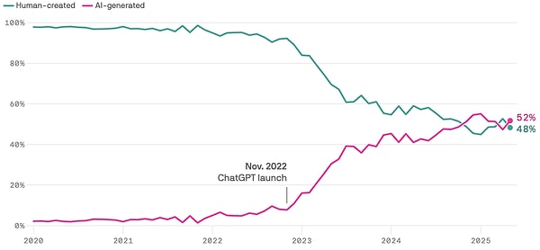 Graphite’in raporuna göre yapay zeka Kasım 2024’te kısa bir süreliğine insan tarafından yazılan içerikleri geride bıraktı, ancak o tarihten bu yana iki taraf arasında dengeli bir tablo oluştu.